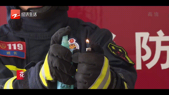 消防员先拿起其中一款防晒喷雾,对着空中进行喷洒,然后打着点火器。当有明火靠近时,立刻发生了燃烧。