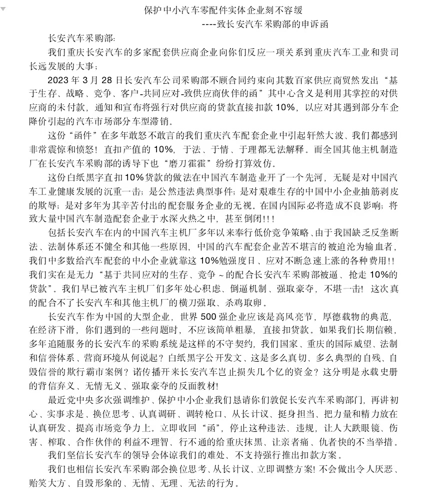 《申诉函》称,写该函的是长安汽车多家配套供应商企业,他们3月28日接到长安汽车采购部发送的《商务函》。供应商们对该《商务函》的理解是,长安汽车采购部凭借其掌控的对供应商的未付款,通知和宣布将强行对供应商的货款直接扣款10%。