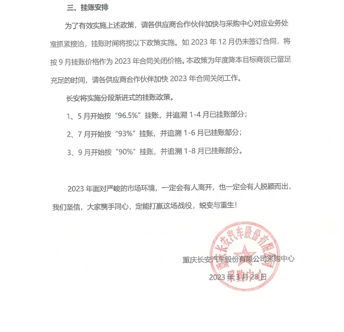 长安汽车采购中心在《商务函》中对各供应商合作伙伴表示,2023年伊始,政企大规模补贴降价引发车市“地震”,行业“洗牌”加速,市面面临残酷的竞争,长安汽车主动担当,推出了“传统动力车型降价20%左右,新能源车型降价25%左右”的销售政策,以价换量,确保各供应商的共同利益。“生存”成为汽车产业链关键词,“先活下来”是共同的首要任务及目标。