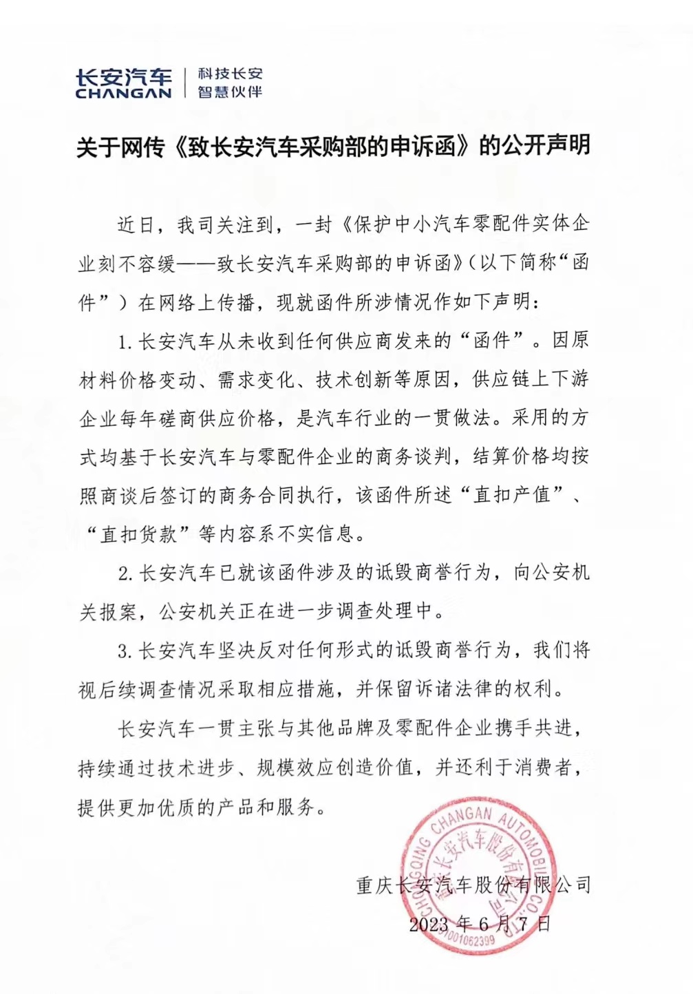 对于此事,长安汽车6月7日中午发布《声明》称,《申诉函》所述“直扣产值”、“直扣货款”等内容系不实信息,长安汽车已就该函件涉及的诋毁商誉行为向公安机关报案,公安机关正在进一步调查处理中。