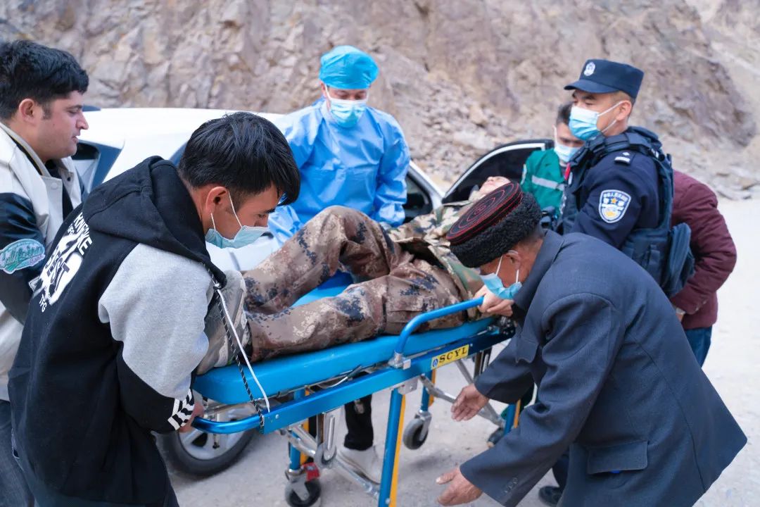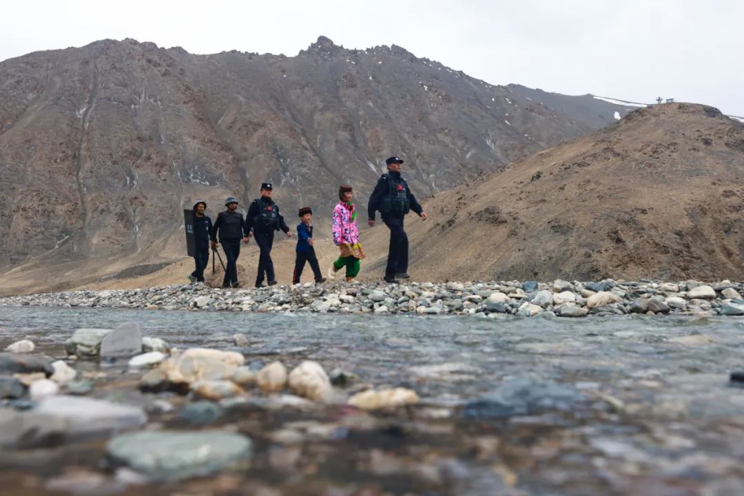 莫尔扎那扎尔和孩子们开启了步巡模式。在海拔4000米的边境一线巡逻2公里多,两个孩子都累得走不动路。