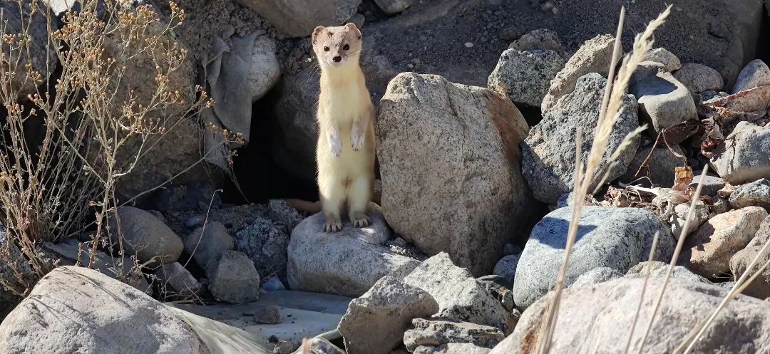 野生动物香鼬和高山兀鹫 朱保华 摄在警务站不远的一处山壁中就藏着一窝新生的高山秃鹫,幼小的秃鹫还无法自己飞翔,站在警务站门口就能看到秃鹫妈妈每天飞来飞去觅食,悉心照顾自己的孩子。
