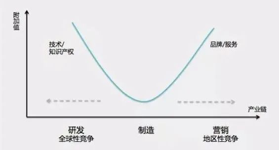 在竞争战略中,宏碁电脑创始人施振荣曾提出了著名的“微笑曲线”理论。大意为价值最丰厚的区域集中在价值链的两端——研发和市场。要增加企业的附加价值,绝不是持续在组装、制造位置,而是往左端或右端位置迈进。