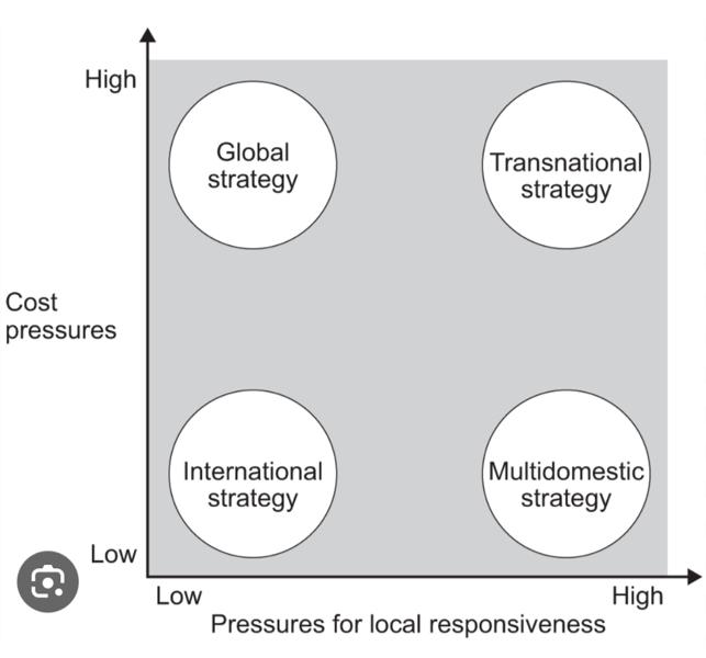 通过这两条线,可以将企业战略分成四个维度,或者四个象限。最上面的象限称之为全球战略Global Strategy和跨国战略Transnational Strategy,然后有国际化战略International Strategy和多国本地化战略Multidomestic Strategy。