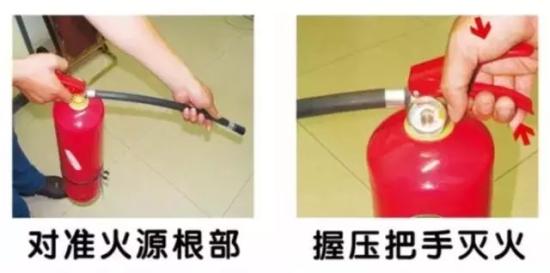 步骤二:拉下软管对准火源根部步骤三:按下压把,喷射灭火