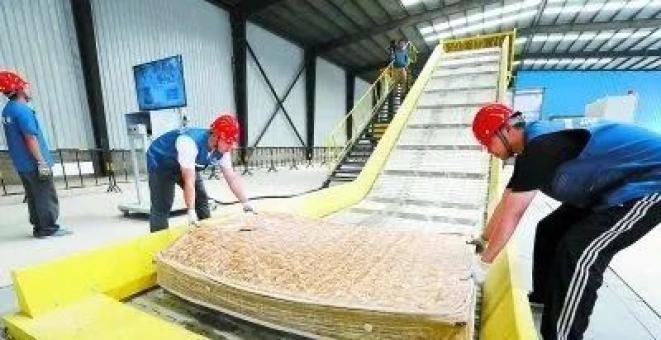 如果遇到大件垃圾搬运不方便的情况,居民可以通过电话、APP等方式,将大件垃圾交由专门的大件垃圾处理厂进行处理。例如:旧床垫、旧沙发等进入专门的大件垃圾处理厂破碎处理后,一个出口出来的是粉碎后的织物,一个出口出来的是弹簧等废铁。织物被压缩送到发电厂燃烧发电,废铁被卖到了钢厂。至此,一件大件垃圾完成了它的资源化回收处理之旅。