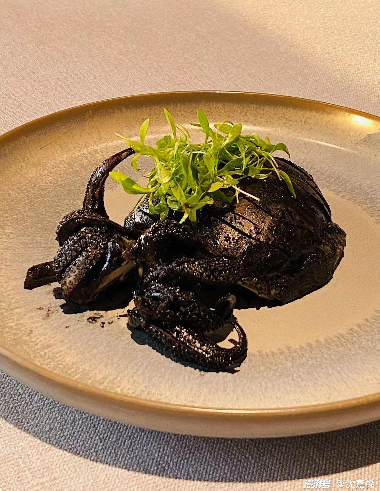 樾鲜酱蟹是用新鲜膏蟹醉制的,从厨房到餐桌,一般也就一个小时。快刀斩件后的这只膏蟹,满膏满黄,肉呈琥珀,鲜香微甘,诱人食欲,这款蟹的源头就在南宋的洗手蟹,《武林旧事》中有记载,但因为樾鲜的醉制手段有了提升,我相信比当年宋高宗在张俊家里吃到的更有滋味吧。
