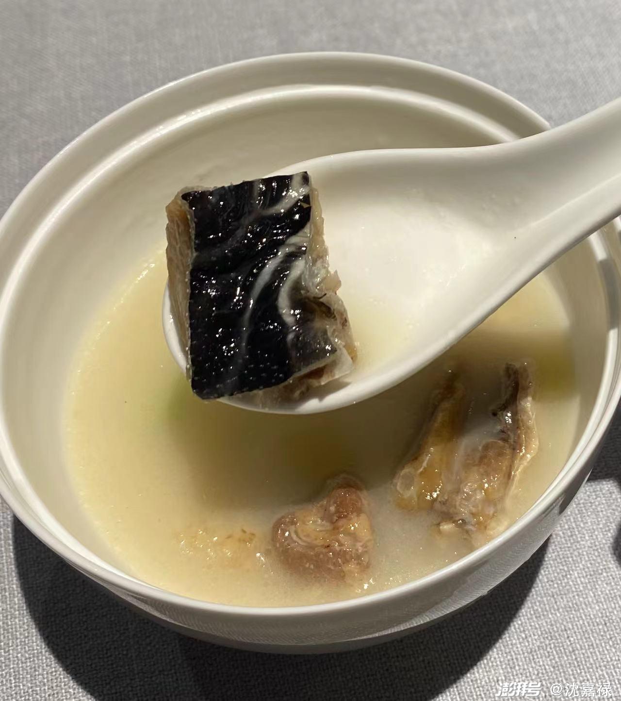 一盅貌不惊人的浓汤花狼鲞也让我大开眼界。多年前有朋友送我一袋乌狼鲞,老婆大人一听是河豚干,顿时花容失色,额头沁汗。这袋乌漆墨黑的鱼干在柜子里躺了小半年,最终被她当作定时炸弹扔了。而在樾鲜,厨师拿来让我看的是一条分割成数块的花狼鲞,稀缺程度超过乌狼鲞,细嗅之下有直率的海鲜香味,味道应该超过鲞中凡品。