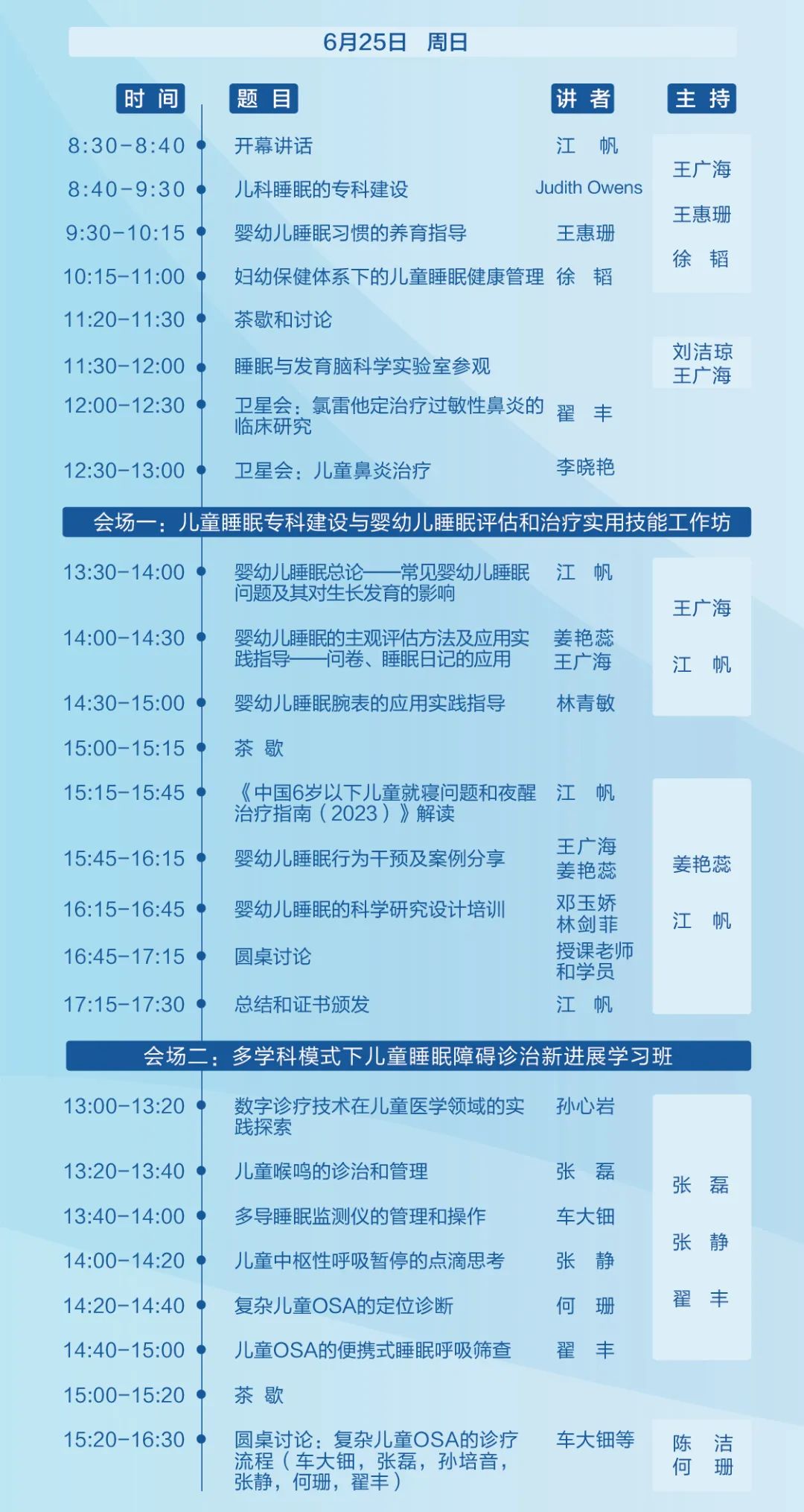 本次学习班还将开展《儿童睡眠专科建设——婴幼儿睡眠问题临床评估和治疗工作坊》,特邀中国医师协会睡眠专业委员会儿童睡眠学组组长、中华医学会儿科学分会儿童保健学组组长及中国医师协会儿童健康专业委员会主任委员江帆教授团队,美国哈佛大学医学院附属波士顿儿童医院睡眠障碍诊治中心Judith Owens 教授(儿童睡眠习惯问卷CSHQ的原作者)、中国疾病预防控制中心妇幼保健中心原主任王惠珊教授、主任徐韬教授针对《中国6岁以下儿童就寝问题和夜醒治疗指南(2023)》、儿童睡眠专科建设、妇幼保健体系儿童睡眠管理策略及婴幼儿睡眠习惯养育指导等进行专题报告和技术培训,促进儿童睡眠专科标准化建设。凡参加工作坊培训的学员完成培训计划并考核合格者,将颁发儿童睡眠习惯问卷CSHQ应用资格证书,并获得在线版CSHQ问卷(3-12岁)200份, BISQ简明婴儿睡眠问卷(0-3岁)200份。完成规定学时及考试合格者将授予国家级继续医学教育Ⅰ类学分10分。