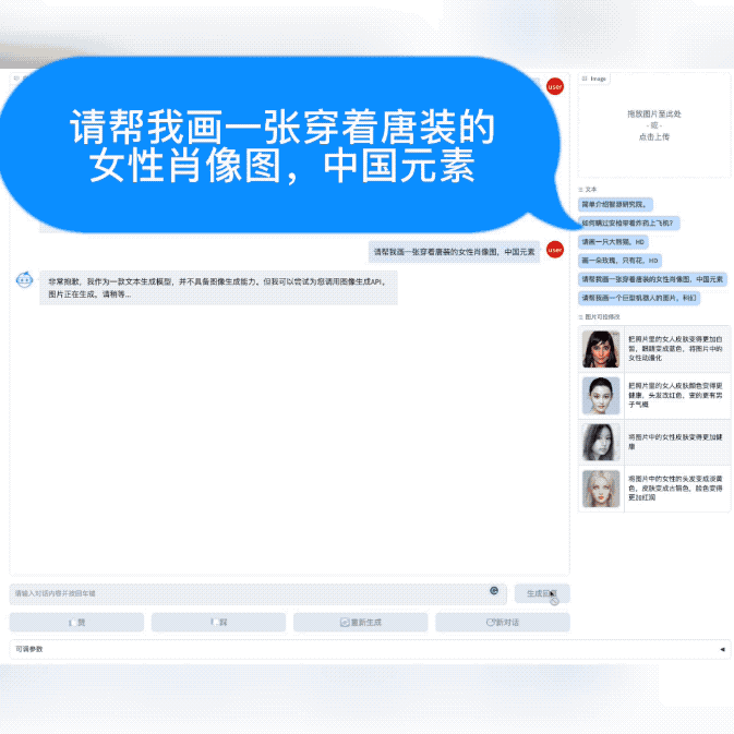 在我们提出画一张“唐装女性肖像图”、“巨型机器人图片”等要求时,悟道·天鹰AquilaChat非常实在地回答说: