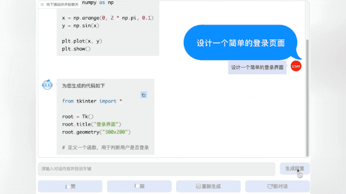 最后,悟道·天鹰AquilaChat还可以调用悟道·天鹰AquilaCode代码模型的能力,在对话中实现“文本-代码”生成。例如直接简单粗暴地告知一声“设计一个简单的登录页面”,它便会啪的一下给出一段代码,而且也是经得住运行的考验: