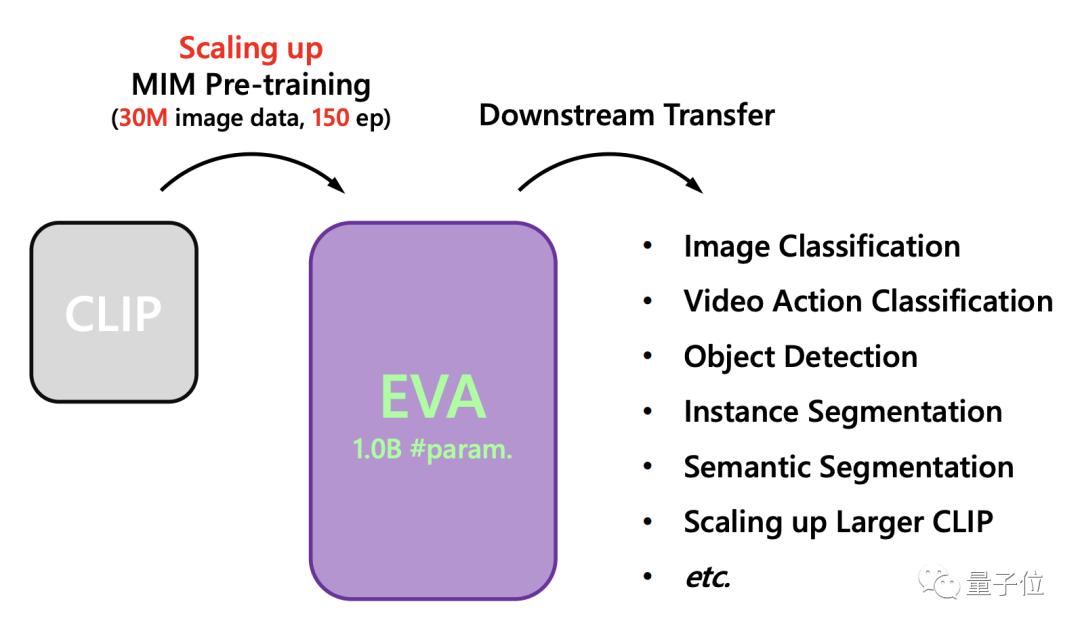 EVA的一大特点便是通过“强强联手”的方式达到了在性能上的突破。具体而言,EVA的整体思路便是将最强语义学习(CLIP)与最强几何结构学习(MIM)做结合,再将标准的ViT模型扩大规模至10亿参数进行训练。