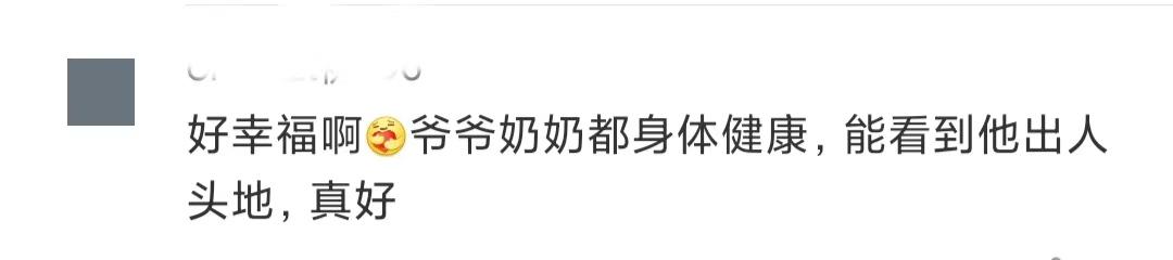 视频发布后,很快冲上热搜,许多网友留言祝福:“好幸福啊!爷爷奶奶都身体健康,能看到他出人头地,真好。”