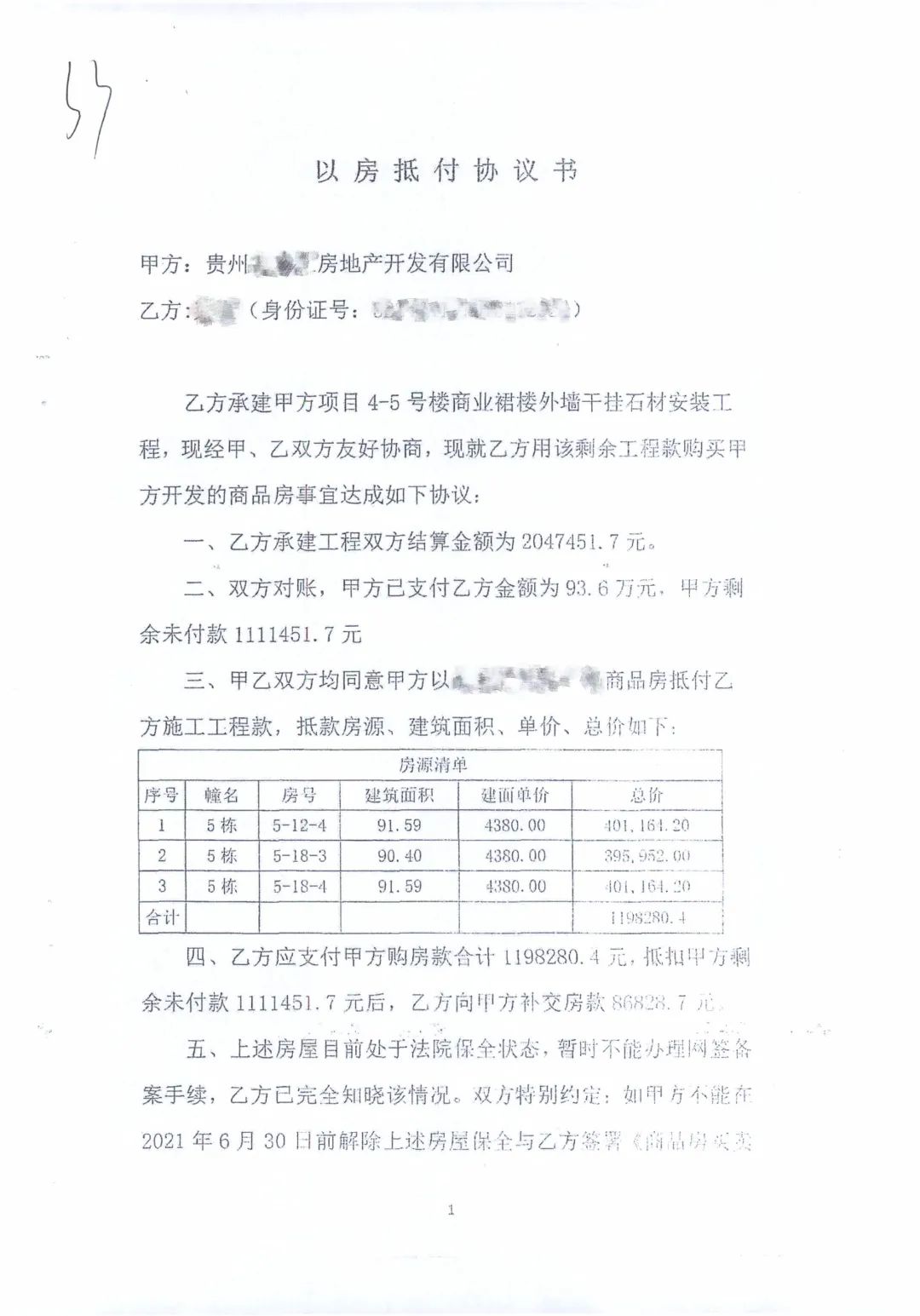 李某与贵州某房地产公司签订《合同》,约定贵州某房地产公司将其位于铜仁市万山区某建设项目的楼外墙干挂石材安装工程以包工包料的方式承包给李某施工。合同签订后,李某按照约定进场施工并完成了案涉工程。后经双方结算,贵州某房地产公司在支付李某部分工程款后,尚欠100余万工程款。经双方协议,贵州某房地产公司用案涉工程处的商品房屋抵扣所欠工程款,并签订了《以房抵付协议书》,协议书对抵扣工程款的的金额、抵扣的房源、房号及商品房单价等作了明确约定。因约定抵扣的房源处于法院保全状态,暂不能办理网签备案手续,双方还在《以房抵付协议书》中约定,如抵扣的房源在2021年6月30 日前不能解除保全状态,将用公司其他商品房抵付给原告。《以房抵付协议书》签订后,贵州某房地产公司曾通知李某签订《商品房买卖合同》未果。之后,李某以贵州某房地产公司未按照合同约定将案涉商品房用于抵付工程款,也未向其支付工程款为由,向万山法院提起诉讼,请求判令贵州某房地产公司支付100余万元工程款及逾期付款利息。