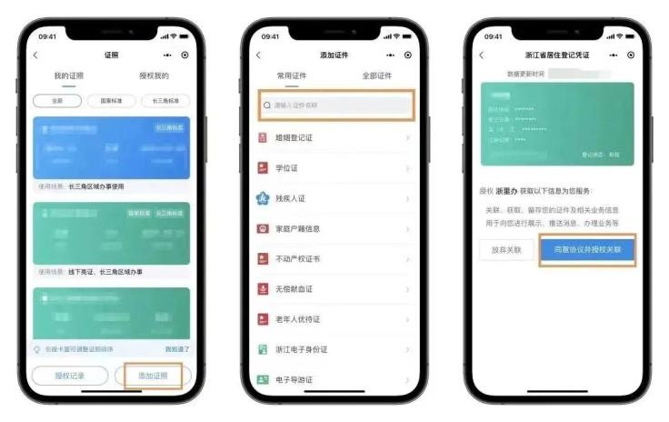 4.确认状态为成功办结后,可前往“我的证照”进行“添加证照”,搜索“居住登记凭证”,同意授权即可成功添加电子凭证。