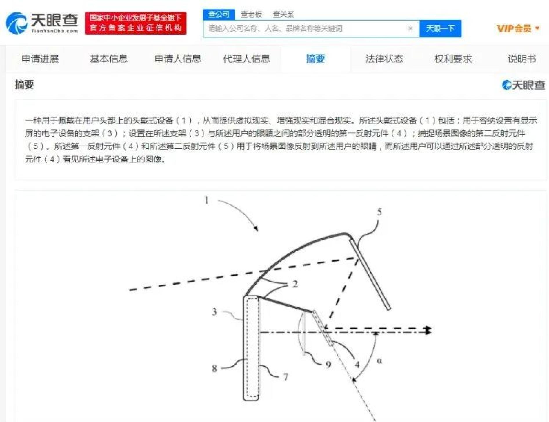 据天眼查App显示,2022年2月华为曾获得“增强现实或混合现实头戴式设备”专利授权,申请人为马科·埃罗马基,申请日为2018年3月20日,授权公告日为2022年2月8日。摘要显示,所述头戴式设备包括用于容纳设置有显示屏的电子设备的支架及多个反射元件,用户可通过反射元件看见电子设备上的图像。