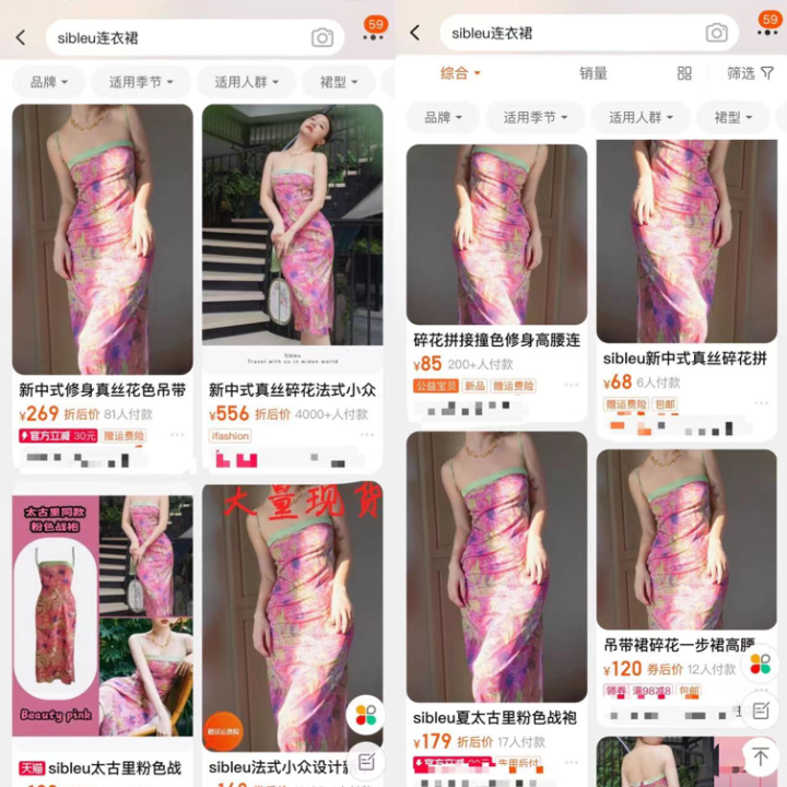 五花八门的淘宝网店,同样晒的是一张类似的同款图,同样都是“SIBLEU法式小众设计新中式真丝碎花裙”。甚至在同一平台,还出现过与的蒙的店铺名只差几个字的“李鬼”网店。