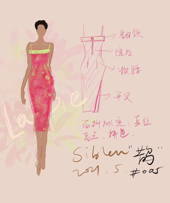 光是这一张图纸设计出来,就花了的蒙和小伙伴一个多月时间,从设计到生产出来大概用了两个月。在图纸变成裙子的过程中,还进行了许多次调整。“设计稿大概是2021年5月左右出来的,我们定下了整个系列的主题是新中式。针对这个风格,我们找了很多的灵感图,包括关于情人节和是中国古典传说的图案,再去做些延伸。”