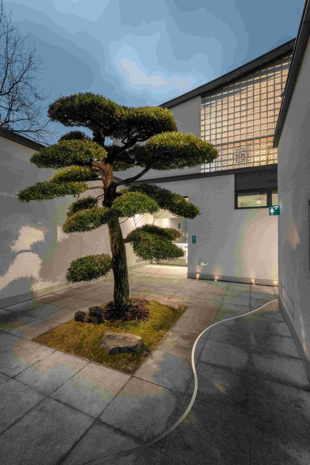 在杭州西湖景区孤山路平湖秋月旁边,一座宋韵园林伫立在一片草坪绿林之上,一步一景,建筑一楼入口是圆形拱门,中庭是一棵翠绿古朴的罗汉松,不了解实情的游客还以为这是哪位名人在西湖边设计的中式庭院。