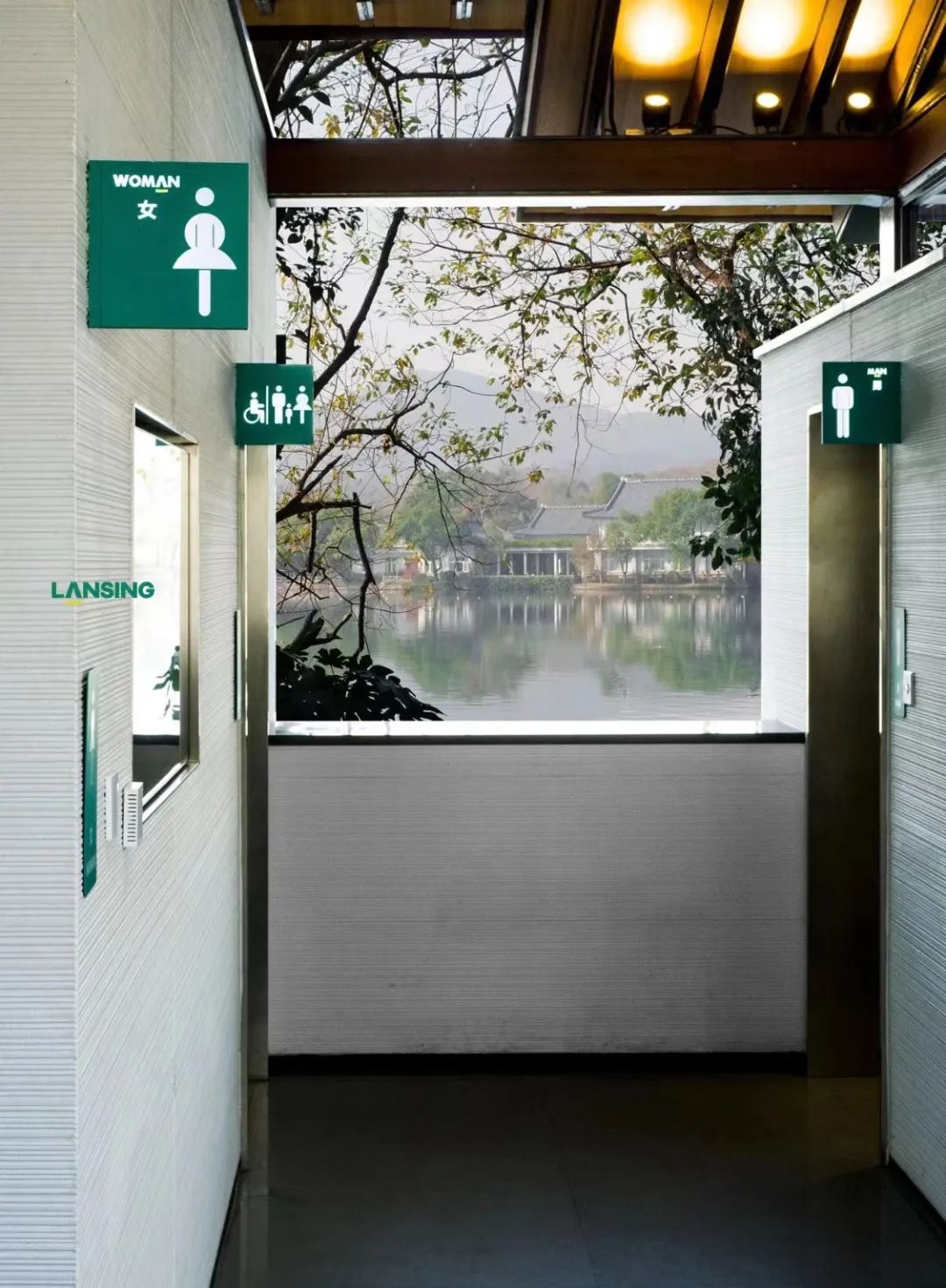 把西湖的景色放进厕所空间内部公厕没有特定的用户,它要面对所有年龄层群体,团队思来想去,还是找到了几个独特的抓手去设置人性化设计。在女性卫生间设置梳妆台,男性卫生间安装全身镜,第三卫生间安置兼顾了残疾人、母婴、儿童等人群的功能,“厕位的尺寸设置、扶手高低、洁具安装位置、标识尺寸等等,每一个点位的设计和尺寸,都参照中国人独特的尺寸,经过了计量与考究。”