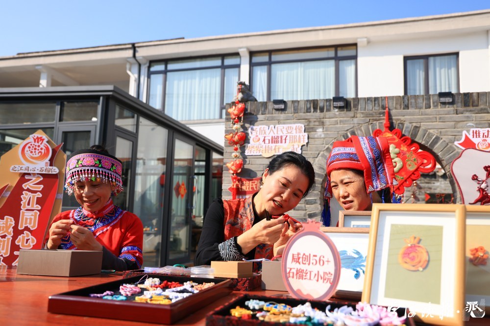 盘扣非遗传承人正在教少数民族同胞制作象征民族团结的石榴红盘扣