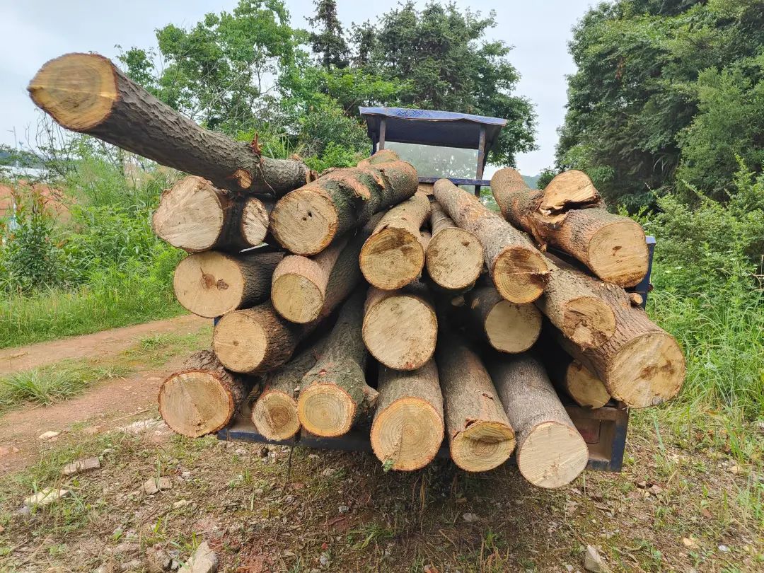 山脚下一辆三轮车里装着20多根被砍的树干调查