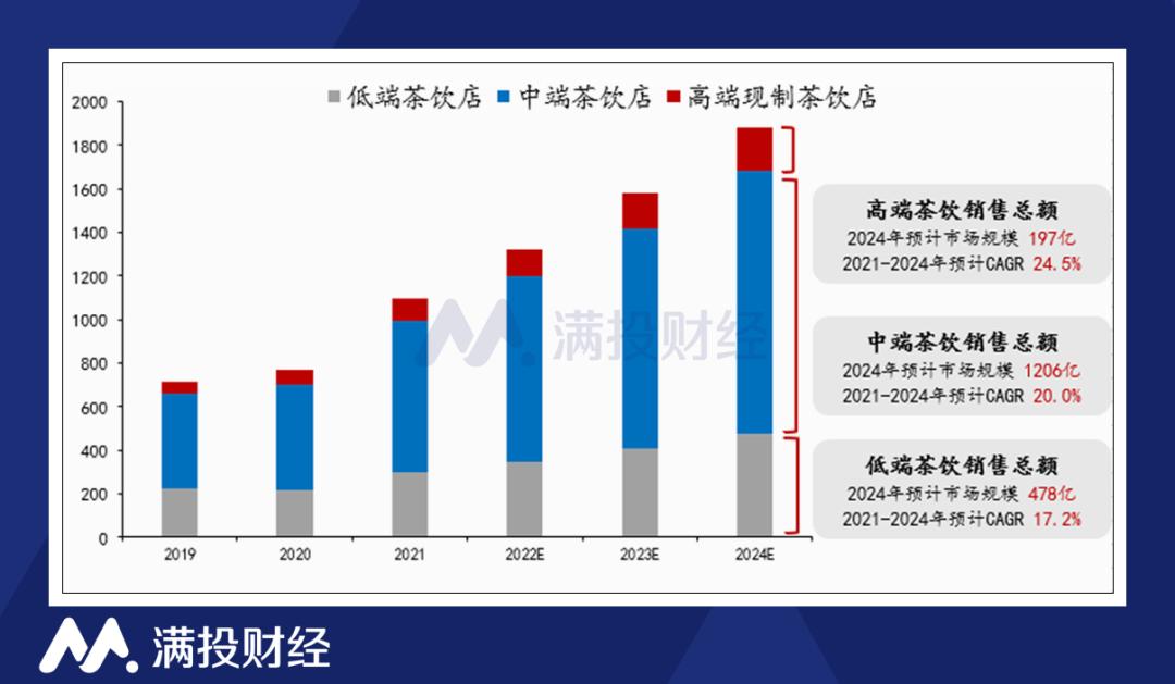 据国联证券发布的研究报告,高端茶饮,指主要以优质茶叶、鲜奶、鲜水果为原料,价格通常控制在20-35元的茶饮品牌,将迎来快速增长期,预计2021-2024年预计复合年均增长率达25.4%,而中端茶饮和低端茶饮分别只有20%和17.2%。
