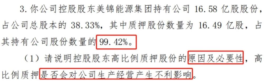 而此次,深交所要公司说明控股股东高比例质押股份的原因及必要性,高比例质押是否会对公司生产经营产生不利影响;说明控股股东未来半年内和一年内分别到期的质押股份累计数量、占其所持股份比例、占公司总股本比例、对应融资余额,并结合控股股东主要财务数据、可利用融资渠道,说明资金偿付能力及具体安排,是否存在平仓风险;核实并说明控股股东是否存在通过非经营性资金占用、违规担保、关联交易等侵害上市公司利益的情况。