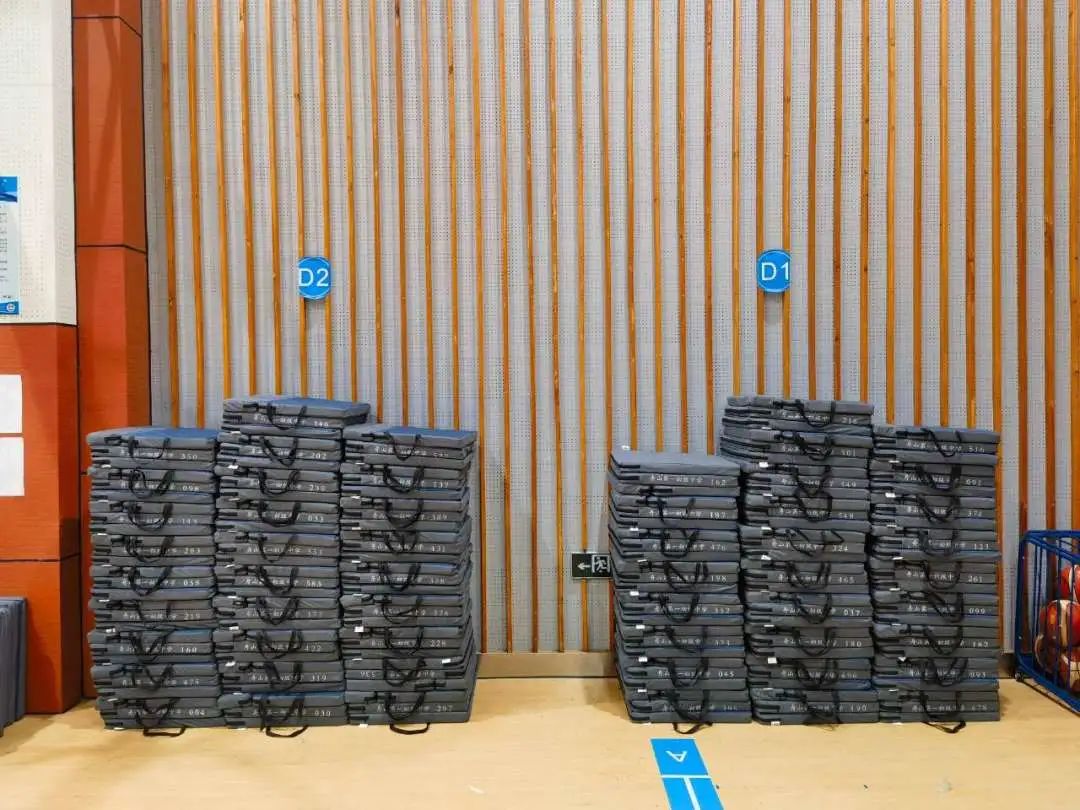 △舟山一初在体育馆安排“男女分开躺睡”,采购了全新的折叠式睡椅和睡垫,还在馆内新设了收纳储物柜和冷冻机。