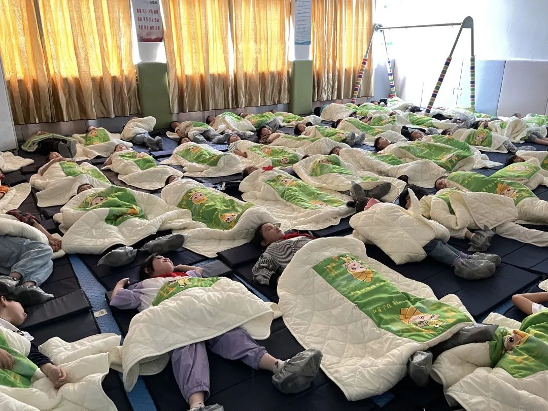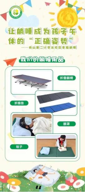 △舟山二小为学生准备了平整的折叠床和透气的垫子,还创设了“餐后动-睡前理-健康睡-睡后理-做正脊”80分钟“幸福躺睡”模式。