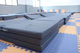 △普陀小学把报告厅、体育馆、图书馆等进行升级改造,一二年级学生睡柔软的瑜伽垫,三至六年级学生睡在支架稳固、便于收纳的折叠床。