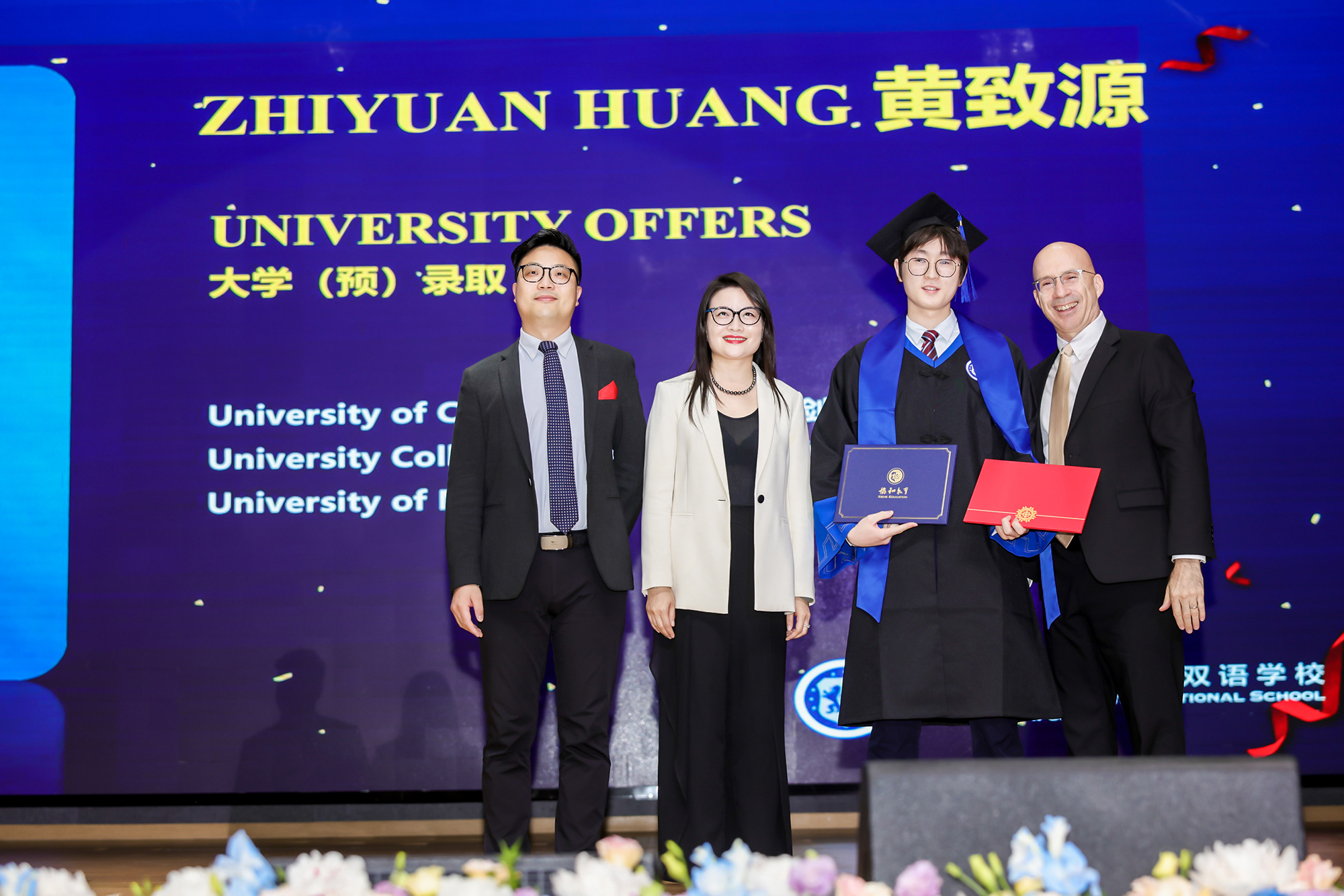 上海青浦区协和双语学校校长黄莹(左二)、外方联合校长Dr. Adam Neufield(刘寅枫博士)(右一)和党支部书记、副校长葛顺勇(左一)为毕业生们一一颁发毕业证书、拨穗,图为被英国剑桥大学录取的黄致源同学(右二)接受毕业证书和拨穗