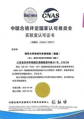 今年5月,清华汽研院(相城)顺利获得中国合格评定国家认可委员会(简称“CNAS”)和中国计量认证(简称“CMA”)的双重认可,一举跻身国家认可实验室的行列,为行业的科研创新树立了最新标杆。