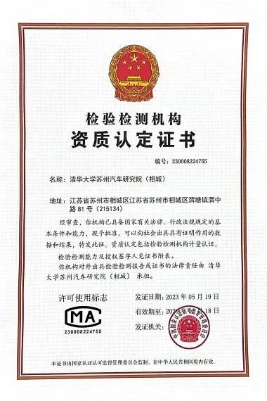 CNAS/CMA认证是国际公认的实验室管理体系和能力的权威认证,是实验室参与国际交流合作、提升技术水平和市场竞争力的重要保障。通过这两项认证,标志着清华汽研院(相城)检测验证能力达到了国际先进水平,为清华汽研院(相城)提供高质量的汽车检测服务和科技创新奠定了坚实基础。连续多年在江苏省产业技术研究院