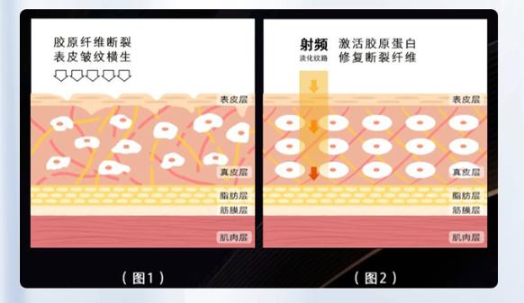 射频是一种穿透性很强的电磁波,通过调节可以选择性的深入到真皮层和皮下脂肪层,对组织细胞进行加热,当温度达到45-60℃时,皮肤真皮层的胶原会即刻收缩,发生变性,就像热水焯肉,肉皮接触热水的瞬间就会产生收缩反应。