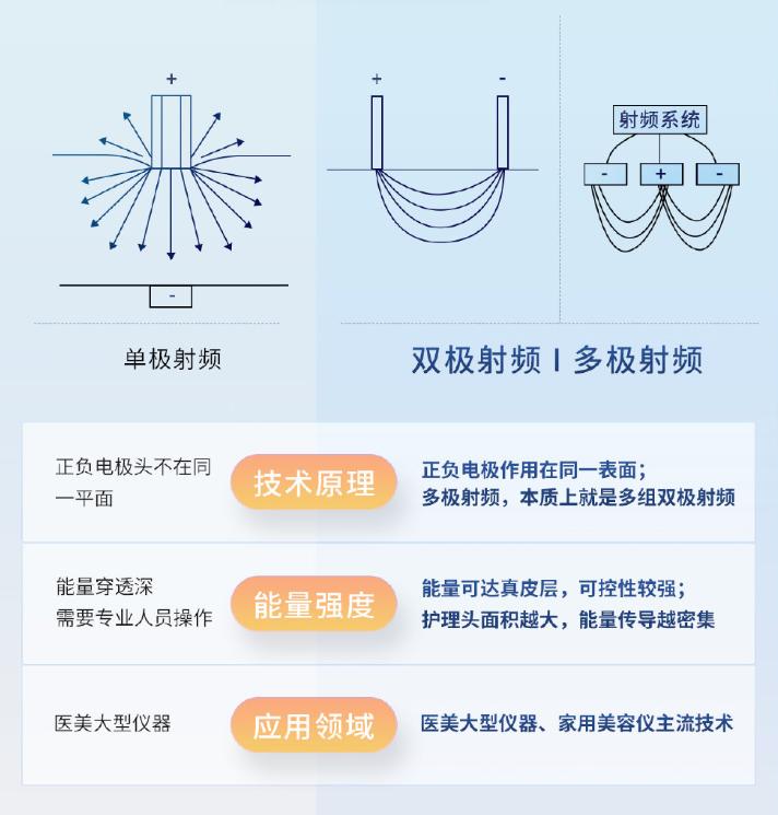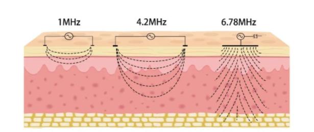 ▵ 频率与作用深度示意图医用射频美容仪器一般采用单极射频,其频率更大,可以达到更深层面,比如1MHz大约能作用到表皮层,2MHz能作用到表皮下层,3MHz则能作用到真皮乳突层,而4MHz可以作用到真皮网状层,比如热玛吉一般4Mhz以上。温度也更高,需要冷却技术配合,且需要专业医生操作,确保对能量的控制。