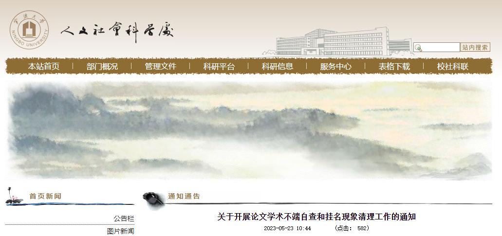 5月23日,宁波大学人文社会科学处网站发布《关于开展论文学术不端自查和挂名现象清理工作的通知》,针对论文学术不端和挂名现象进行为期三个月(2023年5-7月)的自查清理。自查清理对象为2018年1月1日以来,该校师生以宁波大学作为署名单位,发表的学术论文,特别是纳入了人事考核或领取了科研业绩奖励的论文。重点清查范围内的论文是否存在抄袭、剽窃、重复发表等情况。