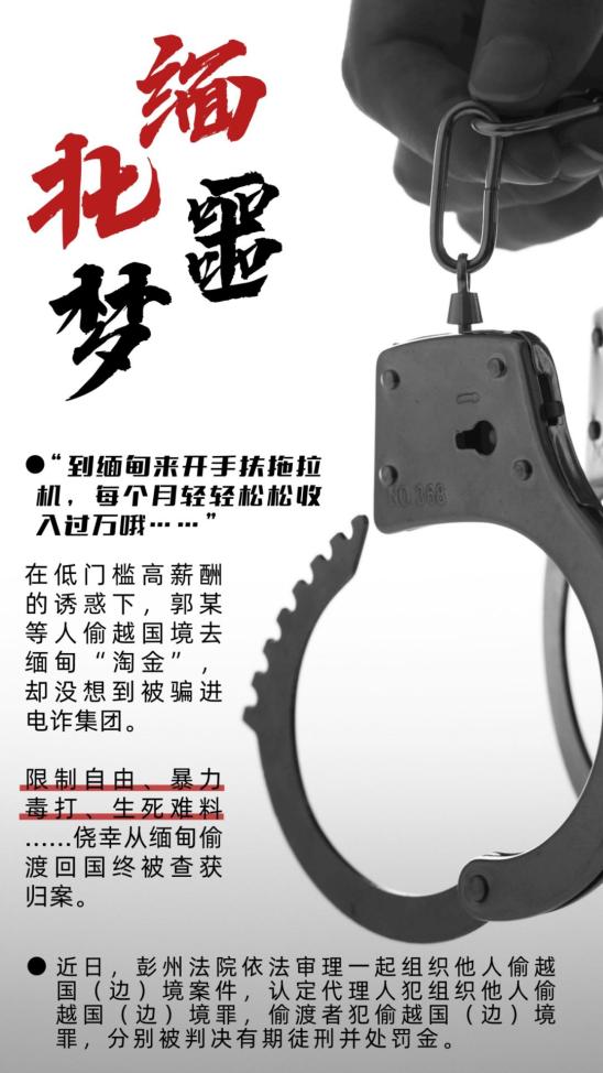 随着全球经济一体化,越来越多求职者选择出国务工,部分不法分子以高薪为诱饵,诱骗求职心切的群众偷渡前往缅北从事非法活动,被骗者不仅“高薪”“暴富”梦碎,还可能面临拘禁、毒打噩梦。广大群众一定保持理智,切莫轻信谣言受高薪诱惑违反国家法律法规偷渡出国(边)境,否则极易身陷险境又触犯刑法。