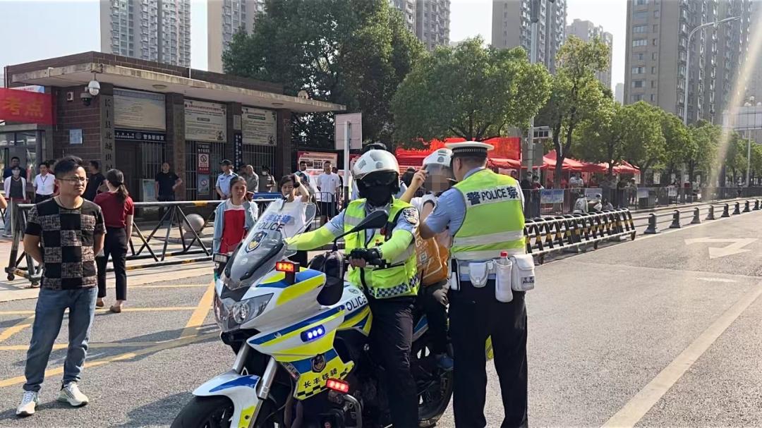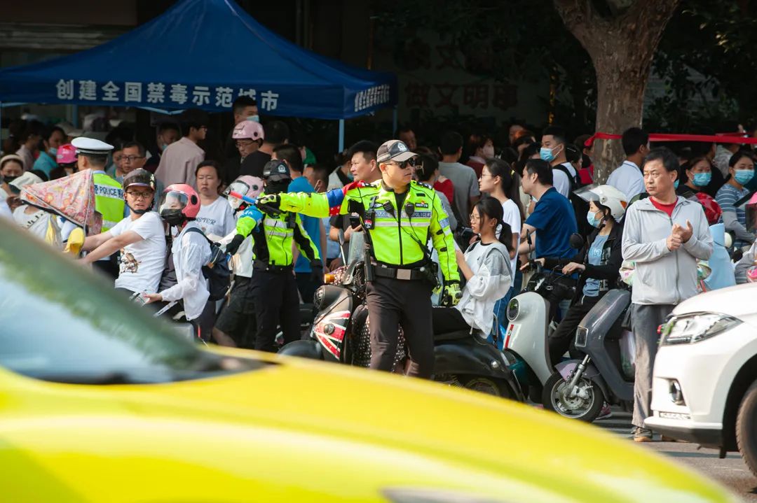 合肥市第九中学考点,交警正在指挥疏导交通。