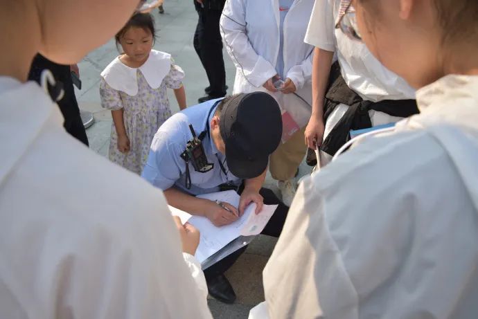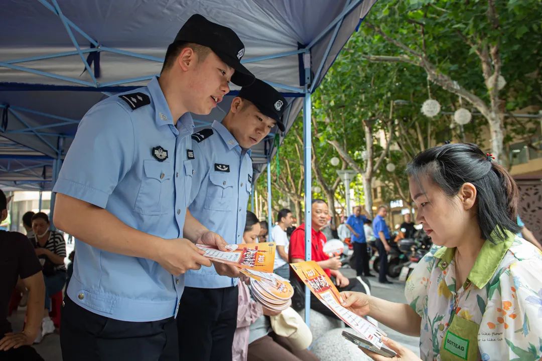 庐阳分局民警、辅警向考场外等候的家长宣传反诈知识,发放宣传资料、纸扇。