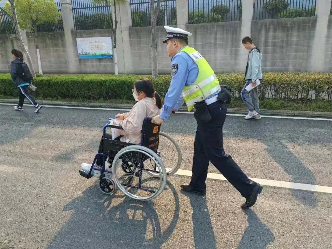 合肥市第十中学考点,一名考生乘坐轮椅行动不便,执勤交警帮助其到达考场。