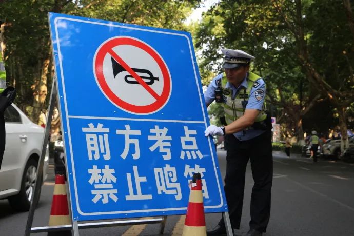 交警在考点附近设置禁止鸣笛标志牌。