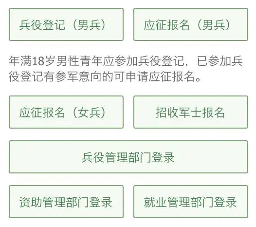 如果你还没有进行兵役登记,请点击“兵役登记(男兵)”进入页面;否则就从“应征报名(男兵)”进入页面。