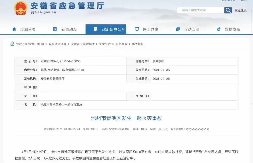 NO.2 贪恋财物,错过最佳逃生时间2021年4月6日,安徽省池州市铜锣湾商场顶层平台发生较大火灾事故,造成4人死亡、2人受伤。据了解,其中3名死者在疏散逃生过程中返回火场收拾财物,错失最佳逃生时机。
