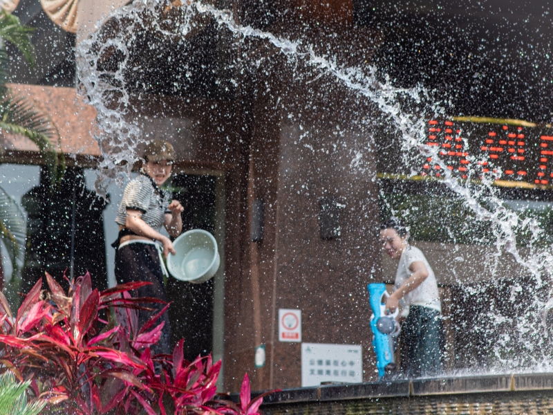 怎样泼水才是正确的姿势?玉南丙介绍,泼水节民间常以“文泼”“武泼”区分。“我们所说的‘文泼’就是比较传统的方式,一种是较为讲究仪式感的从井里取来干净的水,水中盛放鲜花,再用枝桠沾着水轻轻泼在别人身上。另一种是到寺庙里去‘赕佛’,用这些带有芳香的水给佛像清洗身上的灰尘,之后大家用小树枝互相轻洒以示祝福。而‘武泼’则通常是较为常见的泼水狂欢。”