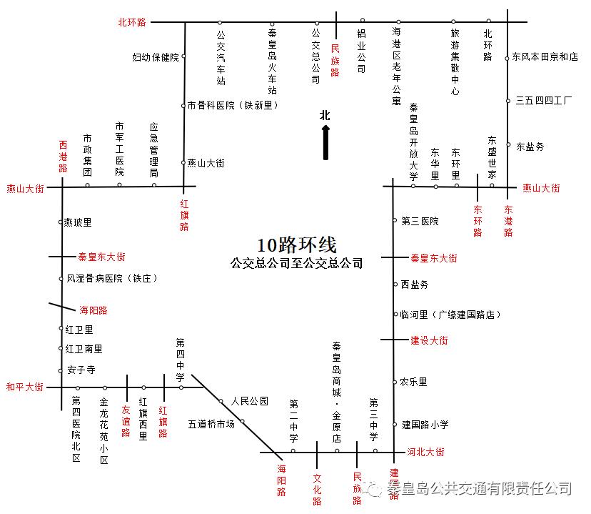 公交总公司、秦皇岛火车站、公交汽车站、妇幼保健院、市骨科医院(铁新里)、燕山大街、应急管理局、市军工医院、市政集团、燕玻里、风湿骨病医院(铁庄)、红卫里、红卫南里、安子寺、第四医院北区、金龙花苑小区、红旗西里、第四中学、人民公园、五道桥市场、第二中学、秦皇岛商城·金原店、第三中学、建国路小学、农乐里、临河里(广缘建国路店)、西盐务、第三医院、秦皇岛开放大学、东华里、东环里、东盛世家、东盐务、三五四四工厂、东风本田京和店、北环路、旅游集散中心(海琪花广场)、海港区老年公寓、铝业公司(禹铭艺术高中)、公交总公司。