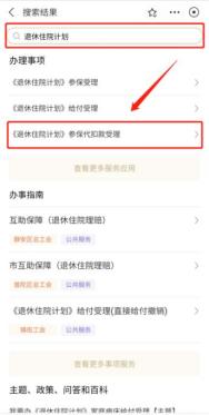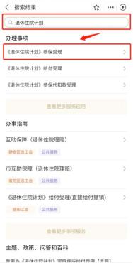 1、在指定参保时间内,打开“随申办”APP或支付宝小程序,首页搜索关键词“退休住院计划”,选择“《退休住院计划》参保受理”服务。