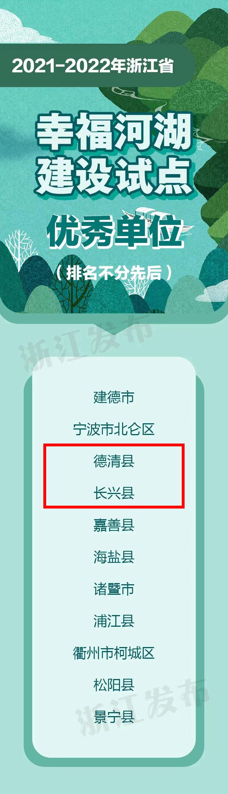 2021-2022年幸福河湖试点县两年建设期满,已完成实施方案建设任务。经县级自评、省级验收评估,确定11个县(市、区)为浙江省幸福河湖建设试点优秀单位。其中,湖州市德清县、长兴县入选。