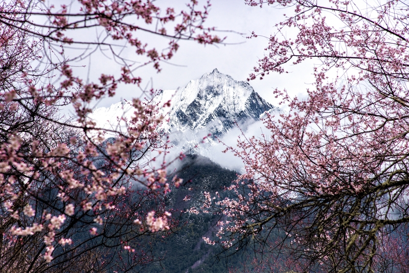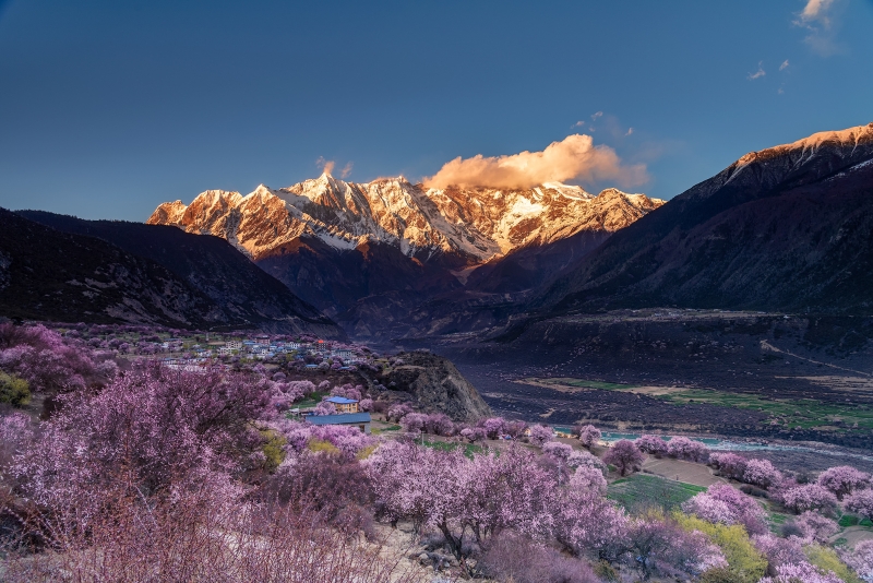 漫山遍野的桃花铺满山坡,绵延至河谷,冰川雪山与桃林形成最梦幻的组合,遗世独立的桃林美得不似人间,这是大自然最奇妙的壁画,从秘境仙境幻化而来的真实礼遇。