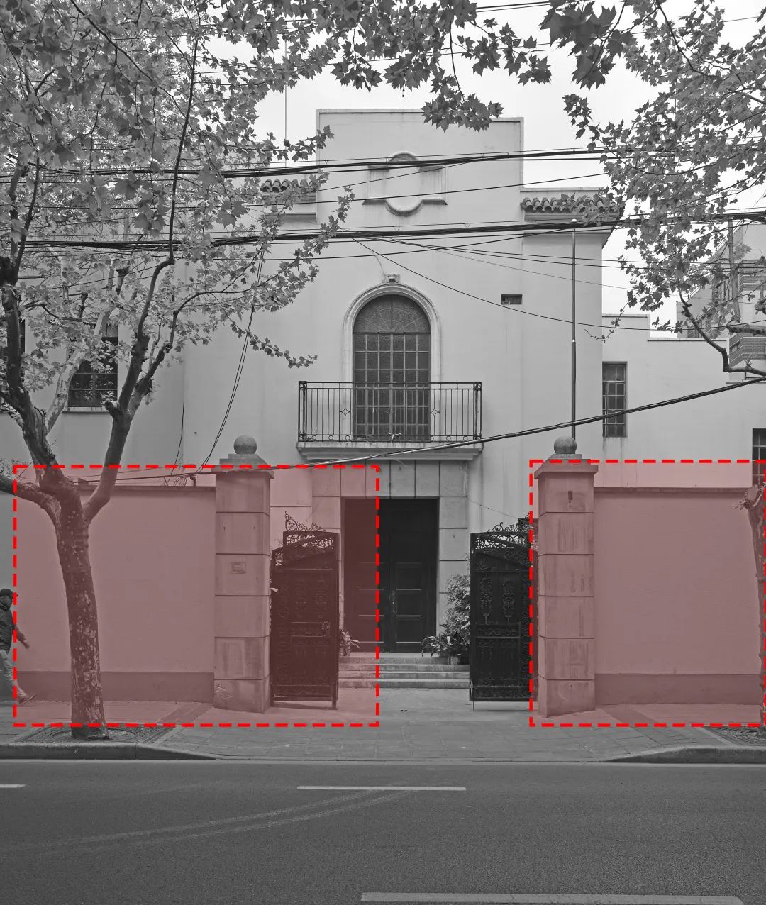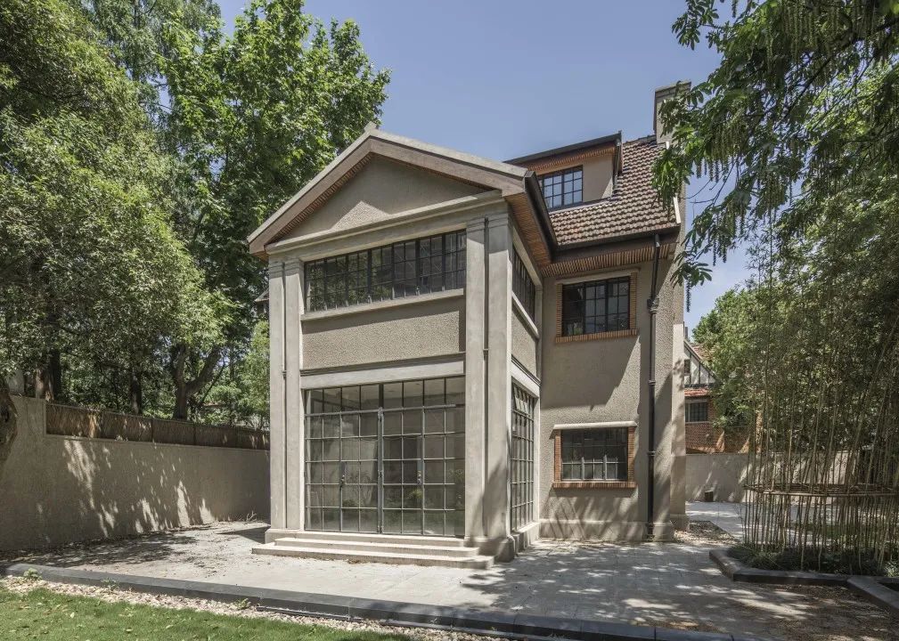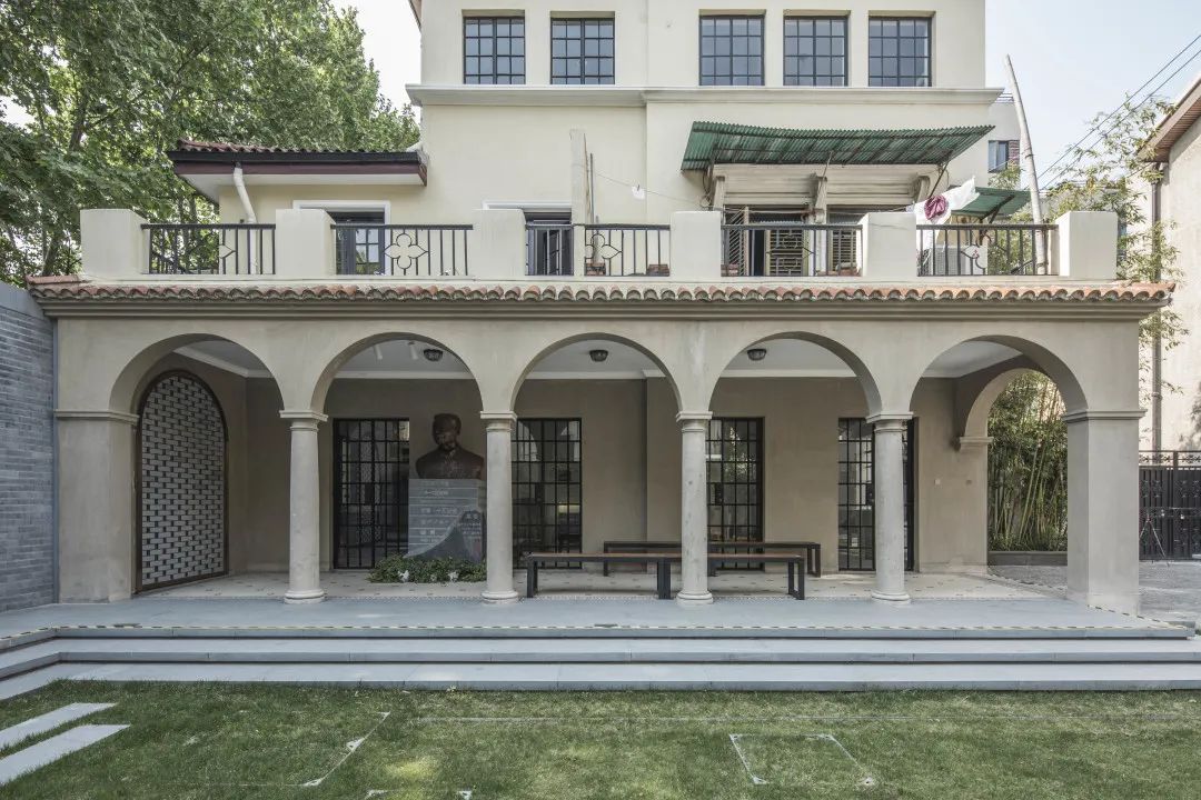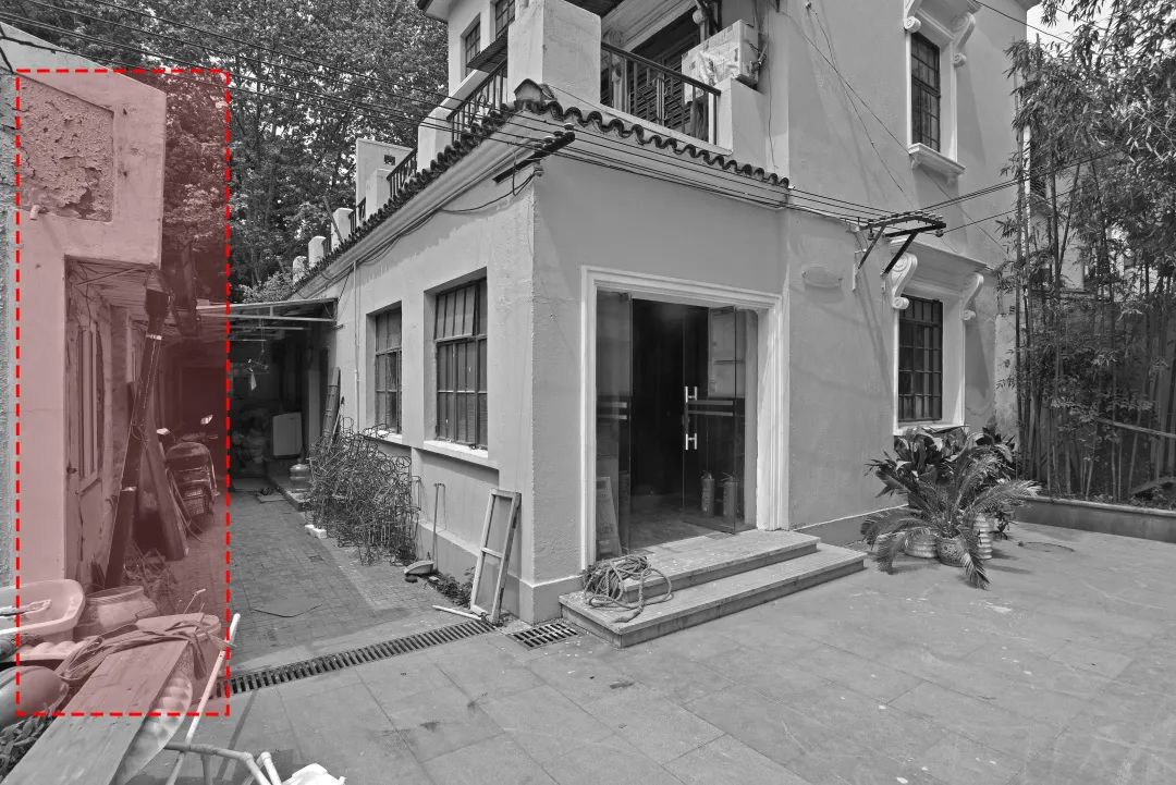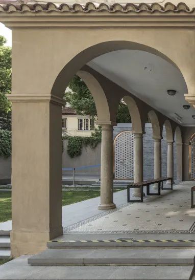 乌鲁木齐南路178号3号楼原为一幢花园洋房,底层塔斯干柱式的拱券敞廊被封堵。修缮恢复了底层原有拱券敞廊,与南向拆除加建后的草坪形成视觉对景。